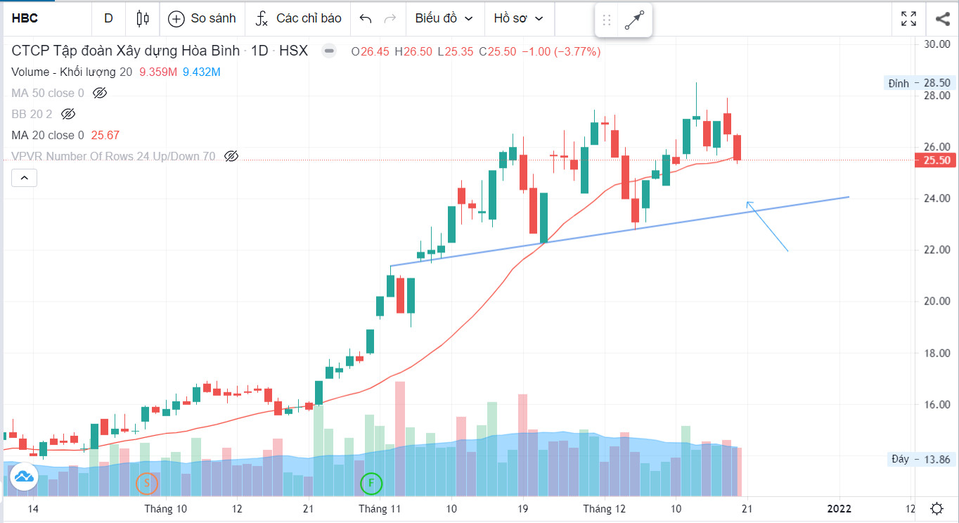 | HHV | 21-22 | 25.5 | -2.3% | 0,0 Tr | BÁN | 27.5 | Tăng | Giảm | 55.5 | Thủng MA9, tìm điểm cân bằng tại MA20 - 25. Nhóm ngành ĐTC vẫn còn rất hot, quan sát tại vùng 25 để có quyết định giải ngân mới. |