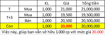 Tính ra, ngày T+3 bạn đã lãi được 1tr. 1 tr này đập vào giá ngày T bạn mua, giúp bạn giảm giá mua từ 21 xuống còn 20. Em cũng F0 nhưng đang nghĩ nó alf như thế