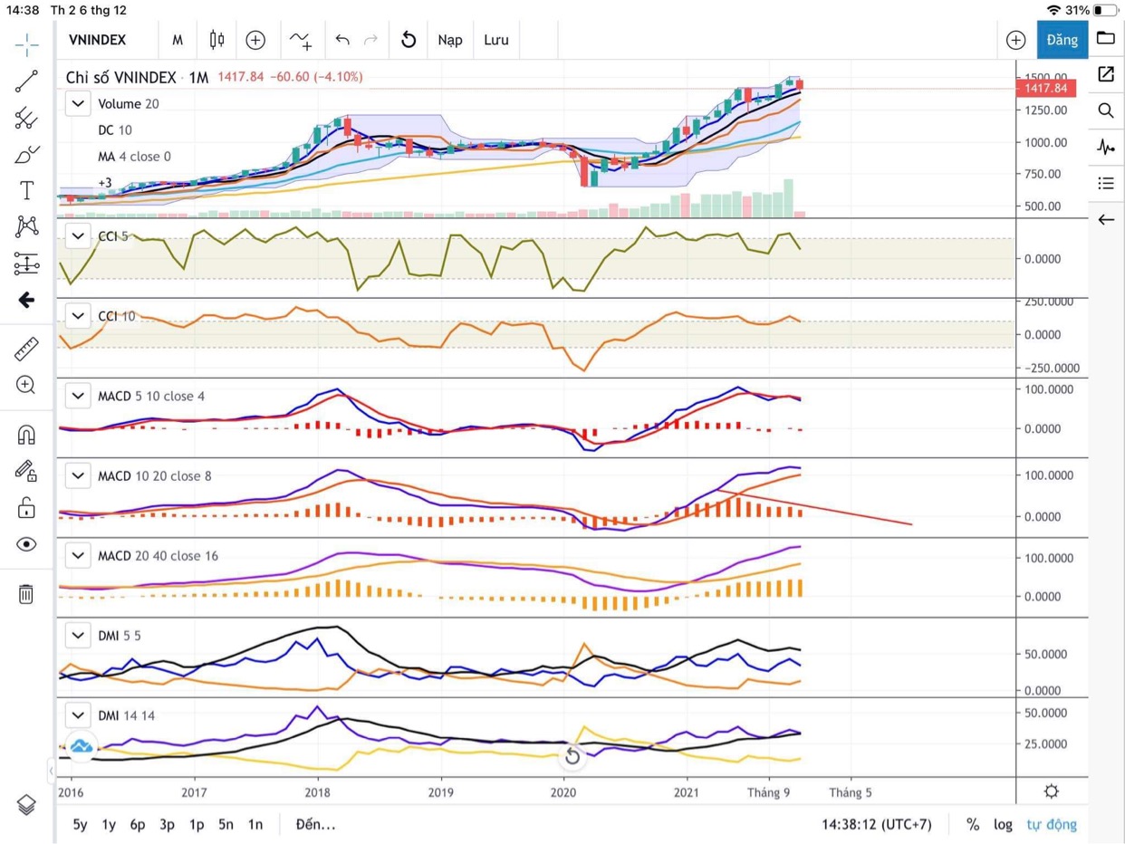 Chúng ta còn hỗ trợ mạnh là ma8 tháng quanh 1380-1390.Giữa DC( Donchian channels) tháng cũng đang lao lên cùng ma8 tháng để đỡ. Hi vọng đỡ đc đi
