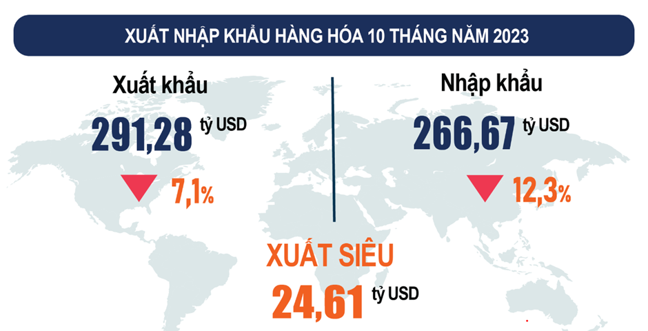==> Tựa chung, cán cân thương mại hàng hóa tháng 10 ước tính xuất siêu kỷ lục 24,61 tỷ USD, gấp 2 lần mức xuất siêu của cả năm 2022 (cùng kỳ năm trước xuất siêu 9,56 tỷ USD).