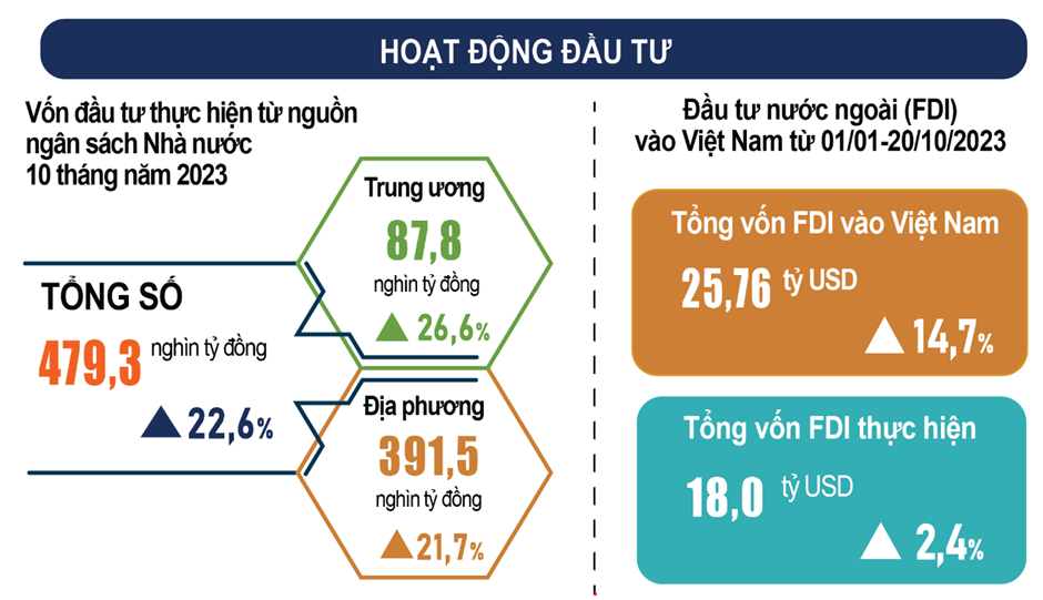 • Vốn đầu tư trực tiếp nước ngoài thực hiện tại Việt Nam 10 tháng năm 2023 ước đạt 18 tỷ USD, tăng 2,4% so với cùng kỳ năm trước. Đây là số vốn đầu tư trực tiếp nước ngoài thực hiện cao nhất của 10 tháng trong 5 năm qua.