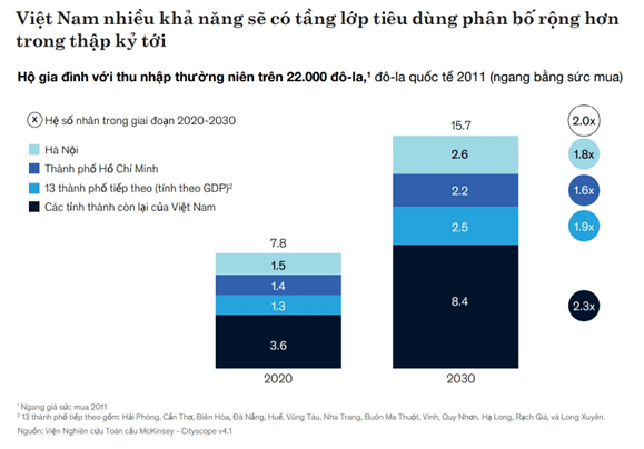 Về câu chuyện đô thị hóa của Việt Nam, chủ đề thường sẽ xoay quanh các thành phố đông dân như Hà Nội và TP.HCM, mỗi thành phố này hiện có hơn 10 triệu dân và tập trung phần lớn tầng lớp trung lưu của Việt Nam. Tuy nhiên, nghiên cứu của McKinsey thấy rằng trong thập kỷ tới, các nguồn tiêu thụ đô thị nhiều khả năng sẽ lan rộng sang các thành phố nhỏ hơn, bao gồm Cần Thơ, Ðà Nẵng và Hải Phòng, nơi tầng lớp trung lưu đang trên đà gia tăng.