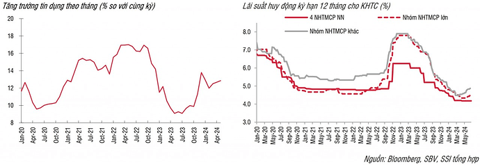 - NHNN có thể thúc đẩy NHTM tăng cường tăng trưởng tín dụng trong nửa cuối năm 2024 khi đã bình ổn được các biến số vĩ mô tỷ giá và lạm phát. Mục tiêu tăng trưởng tín dụng trong năm 2024 là 14% và tăng trưởng GDP đạt 6%.