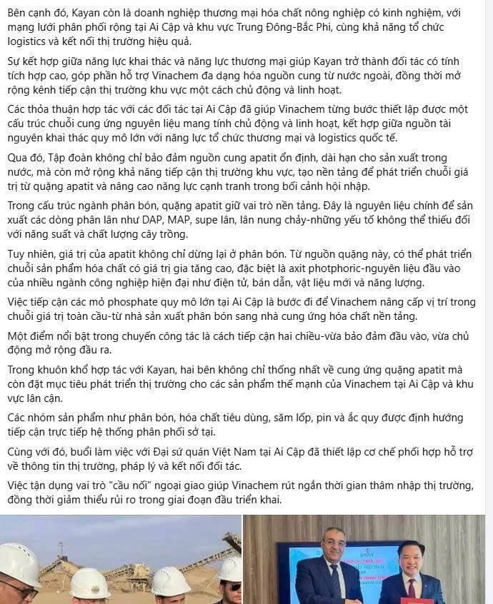 Việc thiết lập quan hệ hợp tác với Misr Phosphate không đơn thuần là ký kết thương mại, mà là kết nối với một “trung tâm tài nguyên” của khu vực, tạo nền tảng cho nguồn cung dài hạn, ổn định và có kiểm soát.