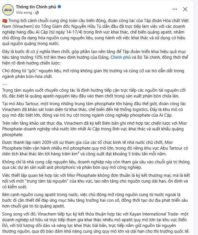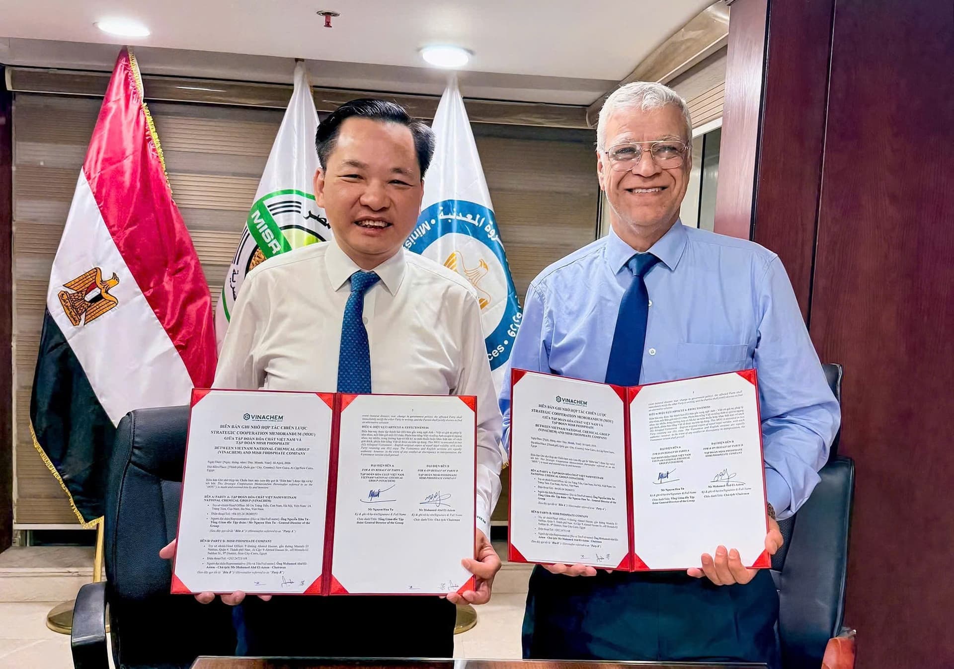 Trên nền tảng khảo sát thực địa, Vinachem đã ký kết Biên bản ghi nhớ hợp tác chiến lược với Misr Phosphate-doanh nghiệp nhà nước lớn nhất Ai Cập trong lĩnh vực khai thác và xuất khẩu quặng phosphate.
