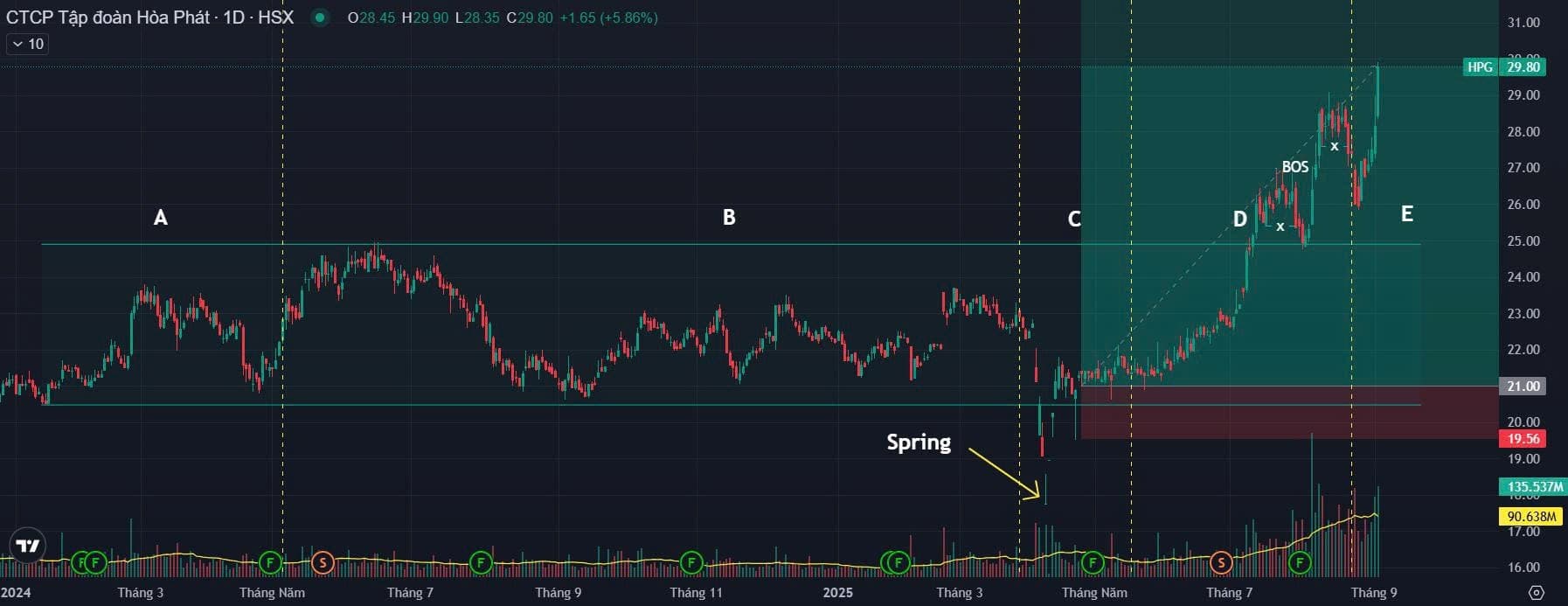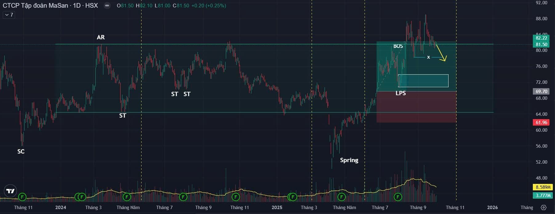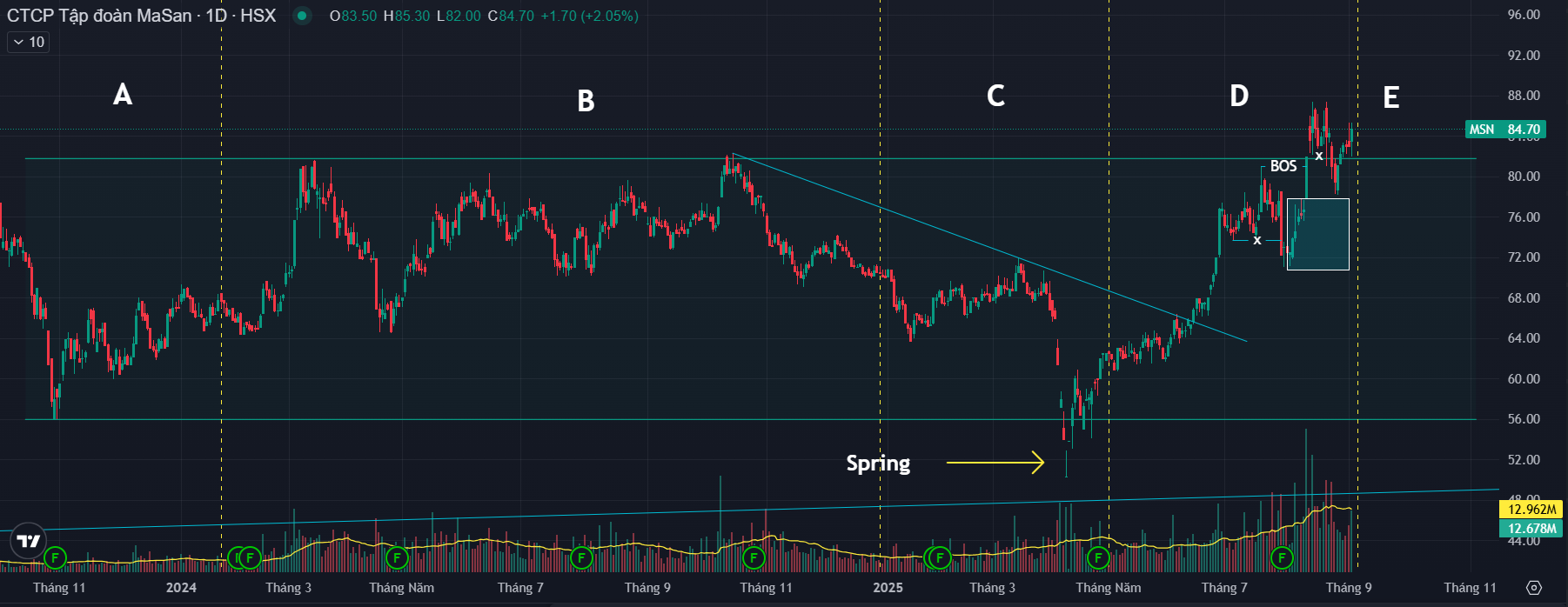 Vận động của MSN cũng tương đồng với HPG, theo cấu trúc giá thì đã đủ điều kiện cần để cổ phiếu bước vào pha tăng nước rút (phase E của cấu trúc vận động Wyckoff).