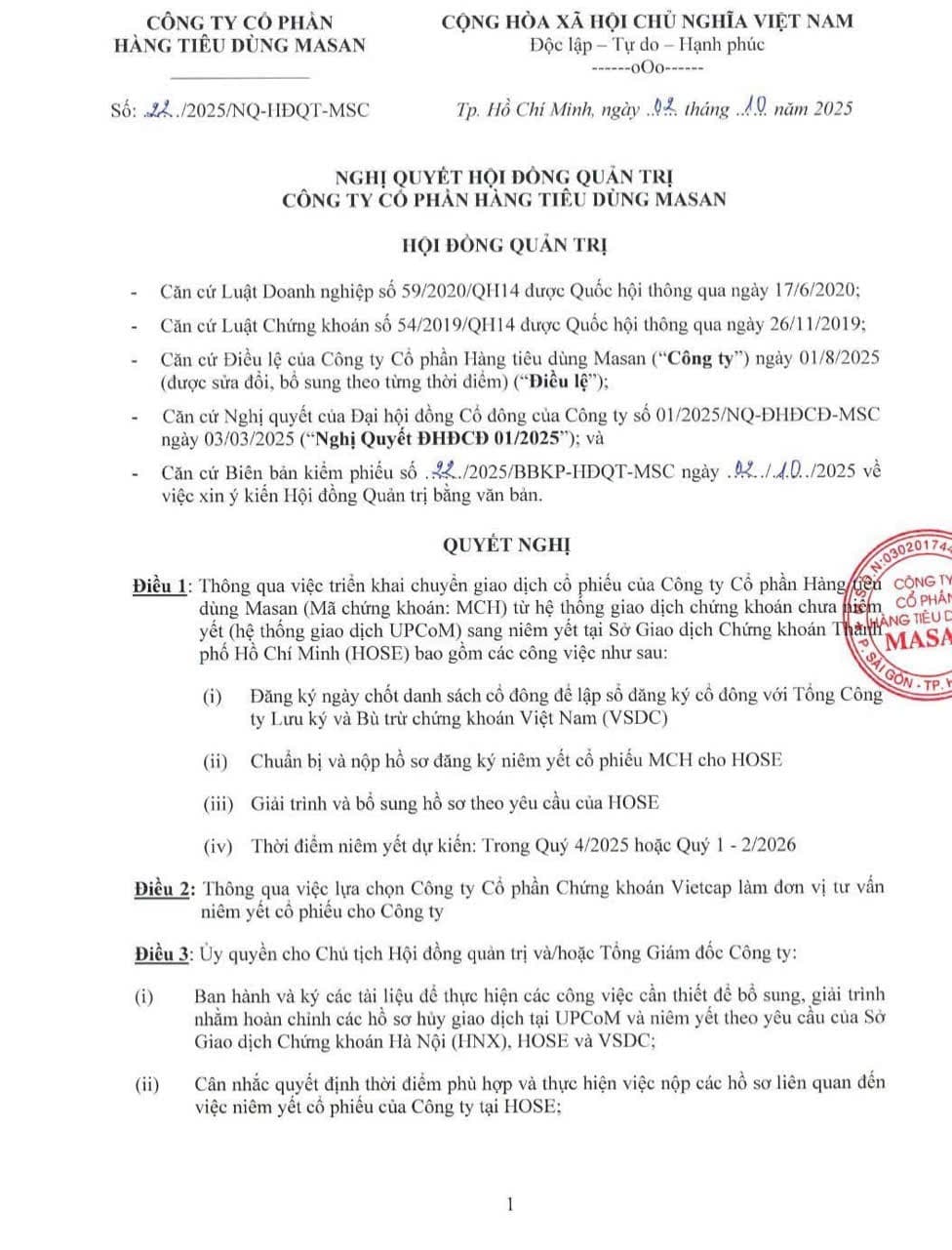 MCH (Masan Consumer) nộp hồ sơ niêm yết lên sàn HOSE, thời gian niêm yết dự kiến quý 4/2025 hoặc quý 1,2/2026, đơn vị tư vấn niêm yết cổ phiếu là Vietcap.
