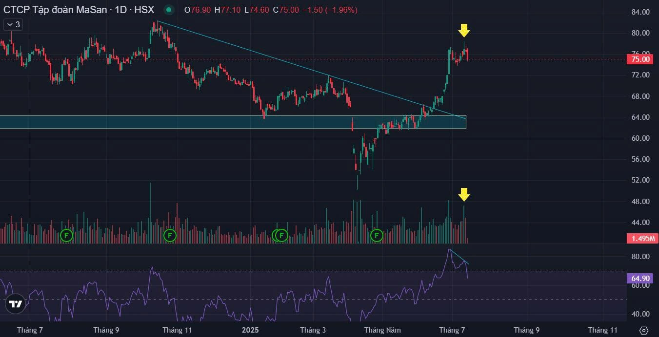 MSN cập nhật phân tích kỹ thuật: Phiên hôm nay tạo cây nến tăng với râu trên dài kèm thanh khoản cao hơn trung bình cho thấy dòng tiền tiếp tục bán ra ở vùng này, tín hiệu phân kỳ âm (đảo chiều xu hướng giảm) tại khung ngày của cổ phiếu vẫn còn và chưa bị phá vỡ.