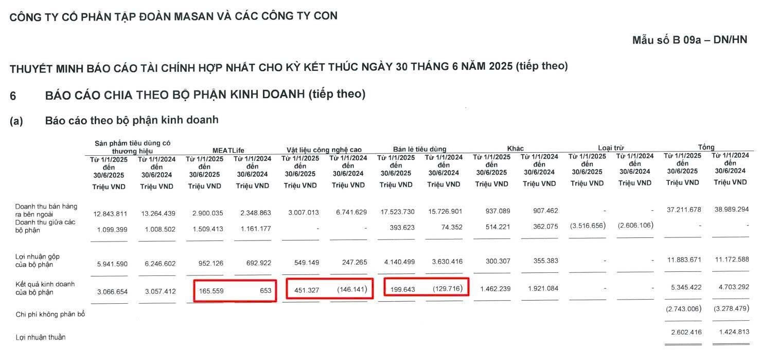 - Mảng kinh doanh có mức tăng trưởng ấn tượng nhất 6 tháng đầu năm gồm MeatLife, Vật liệu công nghệ cao (MSR), và Bán lẻ tiêu dùng (WCM), mảng tiêu dùng (MCH) duy trì đà tăng trưởng nhẹ nhưng chắc.