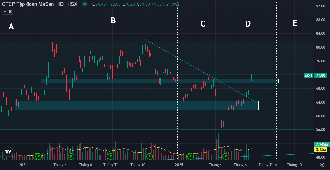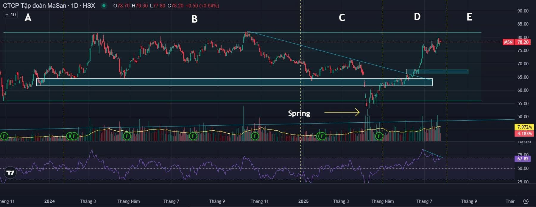 MSN confirm tín hiệu đảo chiều xu hướng giảm tại khung ngày xuất hiện từ phiên 14/7, theo cấu trúc Wyckoff có thể coi đây là nhịp spring cuối trước khi bước vào phase E.