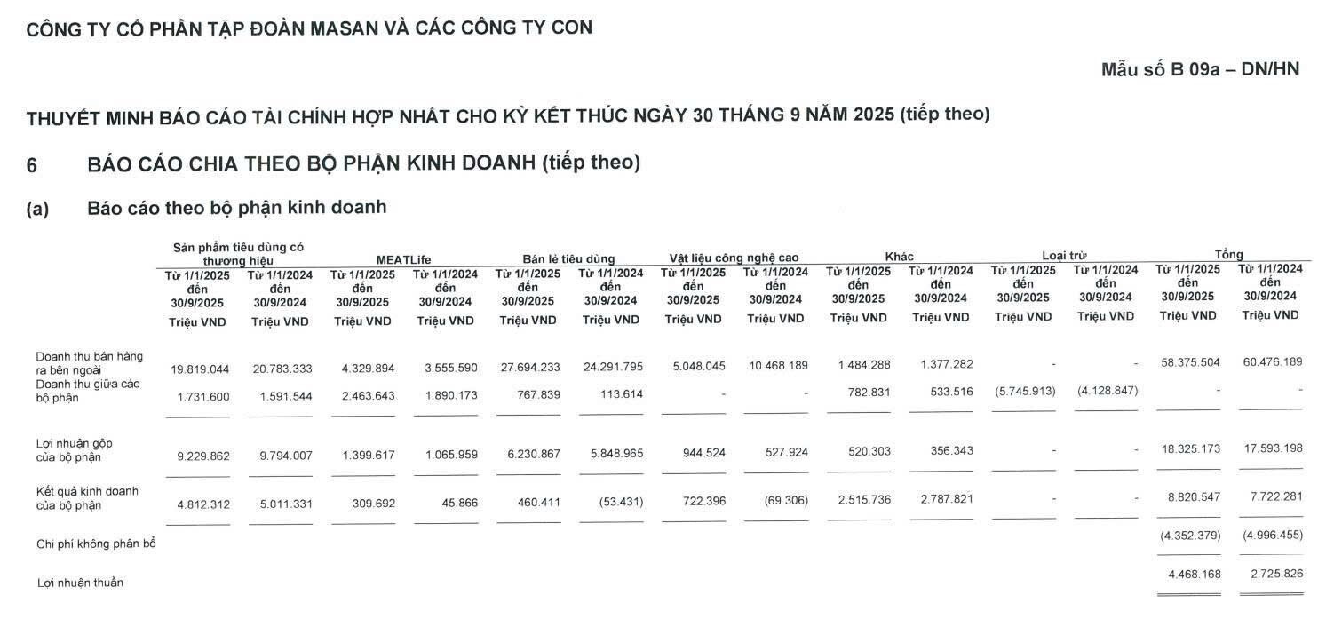 - Kết quả kinh doanh các bộ phận 9T/2025: Sản phẩm tiêu dùng (MCH) giảm nhẹ svck, MeatLife (MML) và Bán lẻ tiêu dùng (WinCommerce) tăng trưởng đột biến.