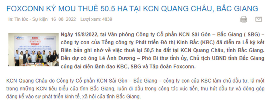 Đã có sự chuyển dịch khi Foxconn ký hợp đồng thuê 50.5 ha đất tại KCN Quang Châu thuộc sở hữu của KBC. [3]