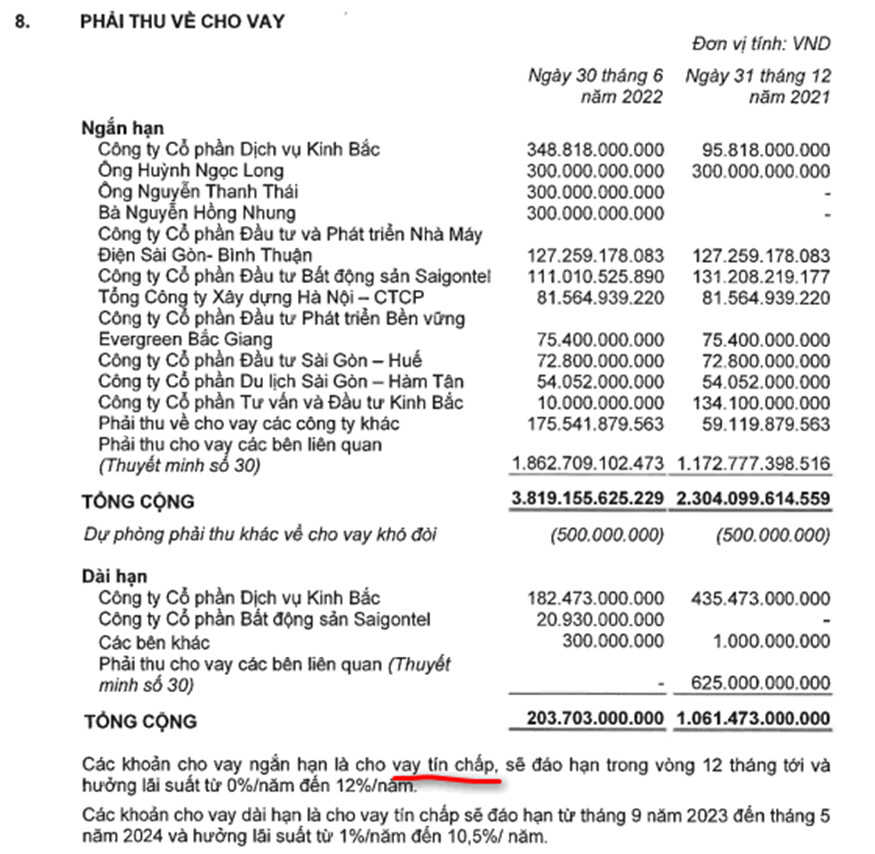 Tiếp theo là Phải thu về cho vay, việc các khoản vay này đều là tín chấp, không có tài sản đảm bảo, nên nếu xảy ra trường hợp không thu được hoặc chuyển thành nợ xấu → công ty sẽ phải trích thêm dự phòng, không chỉ dừng lại ở 500 triệu đồng. Ngoài ra, với thời gian đáo hạn từ năm 2023-2024, công ty cần 1 khoản thời gian dài để thu về tiền cho vay cũng như gia tăng lại cơ cấu tổng tài sản.