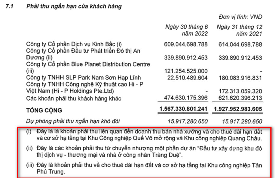 | Phải thu ngắn hạn của khách hàng (gồm cho thuê và chuyển nhượng đất) | Doanh thu cho thuê đất + chuyển nhượng BĐS |