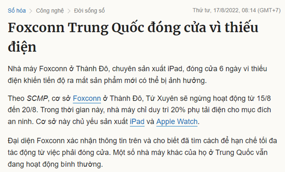 Nếu TQ mở cửa trở lại cũng sẽ khó khăn khi việc thiếu điện vẫn tiếp tục duy trì do hạn hán → trong đó sự kiện gần nhất khi nhà máy Foxconn tại TQ đóng cửa vì thiếu điện.