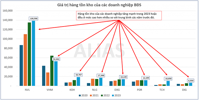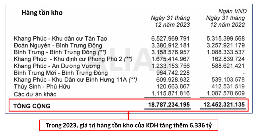 Trong năm 2023, nhiều doanh nghiệp đã đẩy mạnh triển khai dự án, gia tăng hàng tồn kho để chuẩn bị sẵn sàng cho 1 chu kỳ tăng trưởng mới. Các doanh nghiệp có dòng tiền dồi dào không ngại chi tiền để đẩy mạnh triển khai dự án, ví dụ như KDH đã đầu tư thêm 6000 tỷ hàng tồn kho, tăng 50% so với đầu năm.