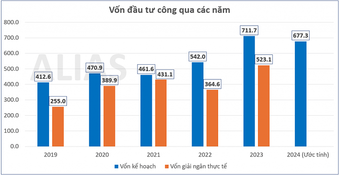 Chưa dừng lại ở đó, trong năm 2024, vốn kế hoạch giải ngân cho đầu tư công khoảng 677 nghìn tỷ, đây vẫn là một mức rất cao trong nhiều năm trở lại đây.