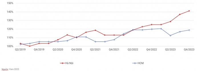Giá chung cư và nhà đất khu vực Hà Nội, Hồ Chí Minh liên tục tăng mạnh, thậm chí vượt xa đỉnh cũ năm 2022. Chỉ trong khoảng 2 năm, giá của chung cư phân khúc trung cấp đã tăng từ 30-50% so với đỉnh cũ.