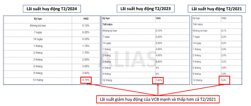Mặt bằng lãi suất thấp là nguyên nhân chính làm cho nhóm cổ phiếu BĐS tăng điên cuồng trong nửa cuối năm 2021. Lãi suất huy động tháng 2/2024 còn thấp hơn so với thời điểm tháng 2/2021, từ đó NĐT có thể kỳ vọng sóng ngành BĐS sẽ sớm quay trở lại.