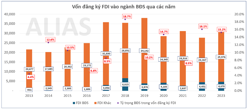 Trong 2023, dòng vốn FDI đăng ký mới vào lĩnh vực BĐS của Việt Nam là 4.67 tỷ USD, tăng 4.9% so với cùng kỳ. Năm 2023 là thời điểm rất khó khăn đối với ngành BĐS, nhưng vốn FDI đăng ký vào lĩnh vực này vẫn có sự tăng trưởng, điều này đã thể hiện sự hấp dẫn của thị trường BĐS Việt Nam mắt NĐT ngoại.