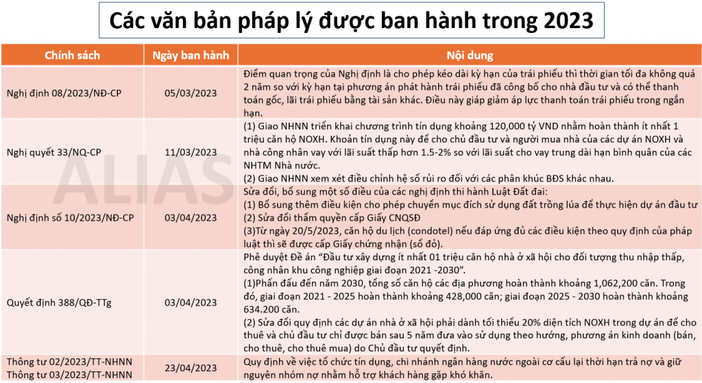 Trong năm 2023, Chính phủ đã ban hành nhiều văn bản pháp lý để hỗ trợ cho ngành BĐS, cụ thể ở trong bảng sau.