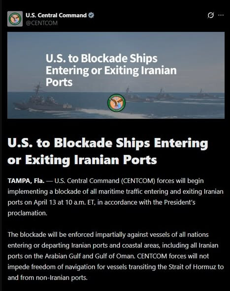 Điểm đáng chú ý là phát biểu ban đầu nghe rất mạnh tay, nhưng phần triển khai thực tế lại hẹp hơn. Trump nói Hải quân Mỹ sẽ bắt đầu phong tỏa tàu ra vào Hormuz, nhưng CENTCOM sau đó làm rõ rằng biện pháp này chủ yếu nhắm vào các tàu đi tới hoặc rời các cảng của Iran; tàu quá cảnh tới các cảng không thuộc Iran vẫn được phép đi lại.