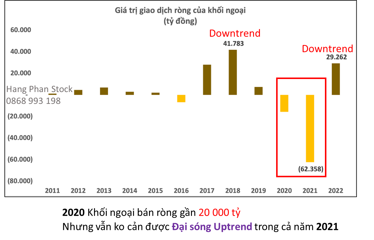 - Còn năm 2020, Khối ngoại bán ròng gần 20 000 tỷ nhưng không cản được Đại sóng Uptrend kéo dài đến hết 2021