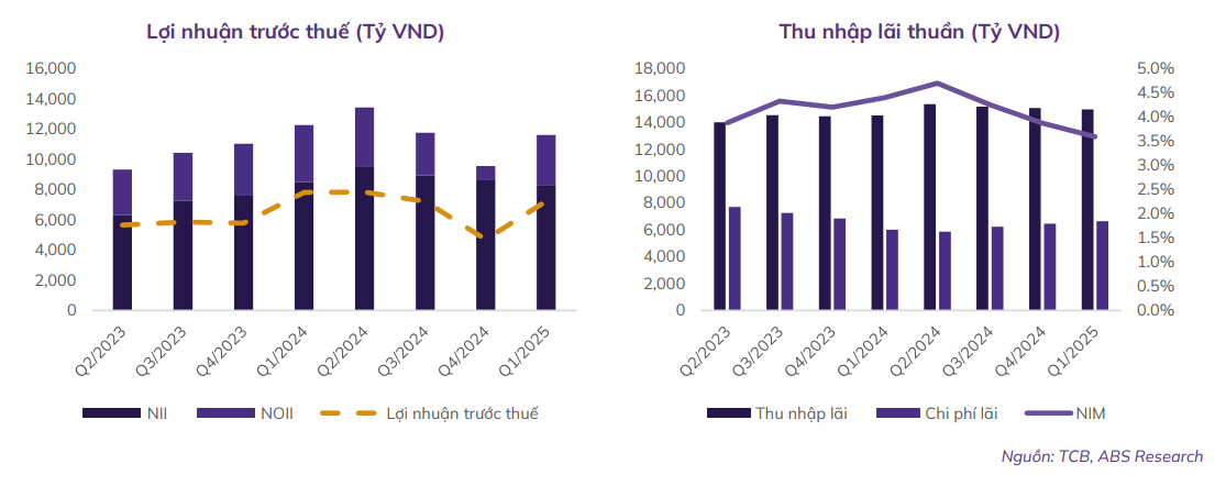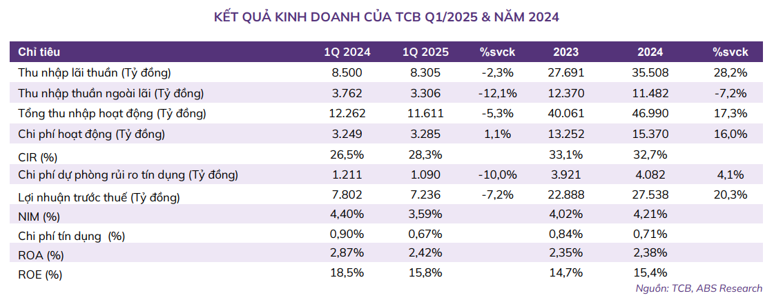 Kết quả kinh doanh Q1/2025 của TCB ghi nhận sự đi lùi nhẹ với LNTT đạt 7.236 tỷ đồng (-7,2% svck) do thu nhập lãi thuần sụt giảm và hoạt động dịch vụ suy yếu.