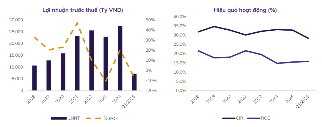 Tổng thu nhập hoạt động trong quý 1/2025 đạt 11.611 tỷ đồng, giảm 5,3% svck. Lợi nhuận trước thuế đạt 7,236 tỷ đồng, giảm 7,2% svck. Nguyên nhân chủ yếu dẫn sự suy yếu trong kết quả kinh doanh đến từ biên lãi thuần sụt giảm và thu nhập ngoài lãi gặp khó khăn.