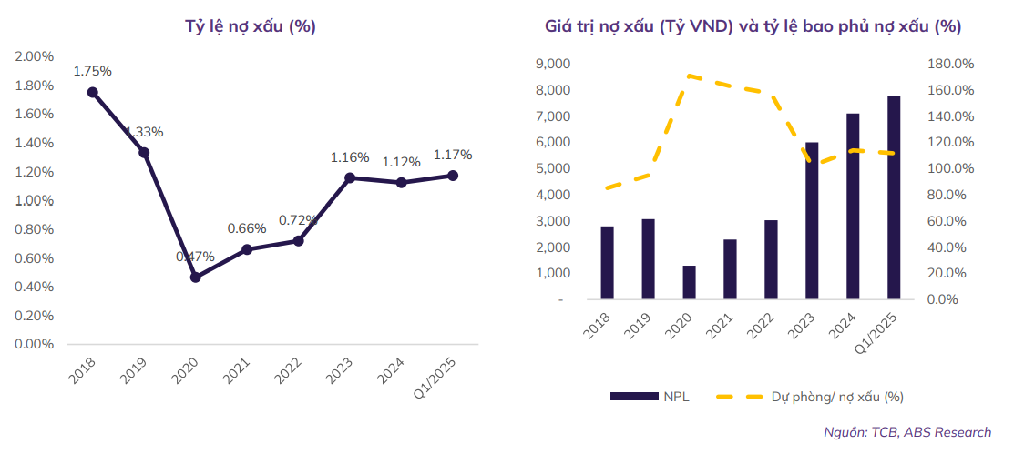 Chất lượng tài sản tuy có sụt giảm nhẹ trong quý 1 nhưng vẫn nằm trong dưới mục tiêu nợ xấu của ngân hàng là 1,5%. Kỳ vọng NPL kỳ vọng dần được cải thiện hơn trong các quý sau và đạt 1,17% trong năm 2025 nhờ (i) Chính phủ dự kiến luật hóa Nghị quyết 42/2027/QH14 về xử lý nợ xấu vào cuối tháng 6/2025, từ đó ngành ngân hàng sẽ có một khung pháp lý giúp thúc đẩy việc xử lý nợ xấu nhanh chóng; (ii) Nền kinh tế cải thiện mạnh mẽ đi cùng với sự phục hồi của nhu cầu tiêu dùng và thị trường bất động sản; (iii) TCB tiếp tục triển khai nhiều chính sách hỗ trợ cho vay hấp dẫn, linh hoạt và phù hợp với đa dạng nhu cầu tài chính, tạo điều kiện cho khách hàng thanh toán các khoản vay. Từ đó, dự báo chi phí dự phòng rủi ro tín dụng ở mức 4.486 tỷ đồng (+9,9% svck), đồng thời TCB sẽ dùng 2.830 tỷ đồng xử lý nợ xấu (+6% svck), tỷ lệ dự phòng bao phủ nợ xấu dự kiến cải thiện lên mức 114,4%.