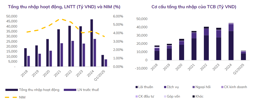 NIM tiếp tục chịu áp lực và đạt 4,0% trong năm 2025 do TCB tiếp tục phải tăng lãi suất huy động và giữ lãi suất cho vay ở mức thấp để thu hút khách hàng trong bối cảnh các ngân hàng tiếp tục cạnh tranh gay gắt như hiện nay. Tuy nhiên ngân hàng có thể tiếp tục cải thiện tỷ trọng bán lẻ trong cơ cấu tín dụng và duy trì tỷ lệ CASA cao để bù đắp lại các tác động của việc tăng lãi suất. Dự báo NIM sẽ dần hồi phục vào cuối năm 2025 và đà phục hồi tiếp tục được duy trì sang năm 2026 khi bán lẻ và thị trường bất động sản được cải thiện giúp đẩy mạnh nhu cầu tín dụng, đồng thời, gói và chính sách hỗ trợ lãi suất sẽ thu hẹp khi nền kinh tế hồi phục, mang lại lợi suất cho vay cao hơn.