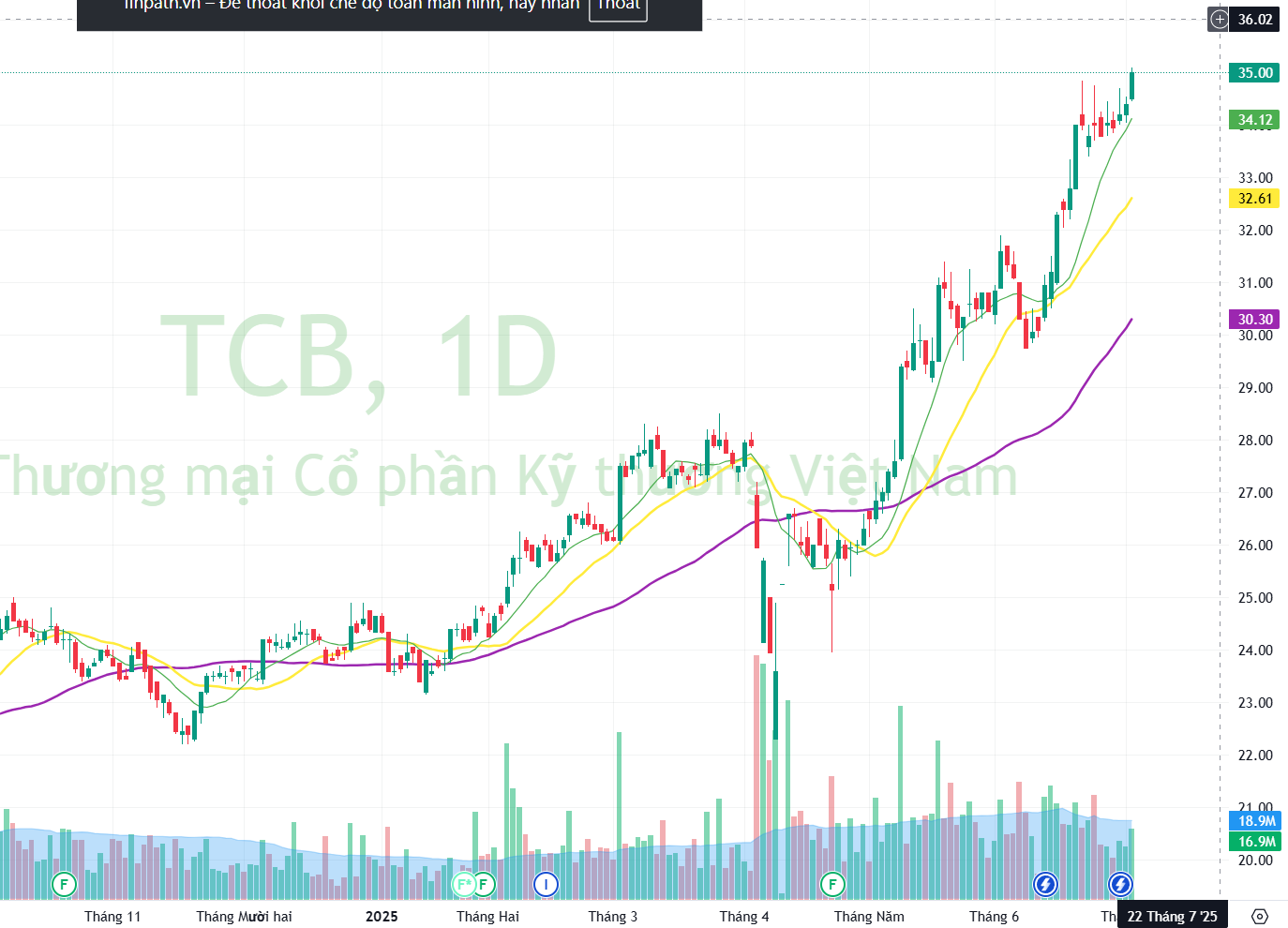 Hiện tại: TCB đã tăng gần 40% từ đầu năm 2025, đạt 33.950 đồng/cổ phiếu (ngày 27/06/2025), vượt đỉnh lịch sử.