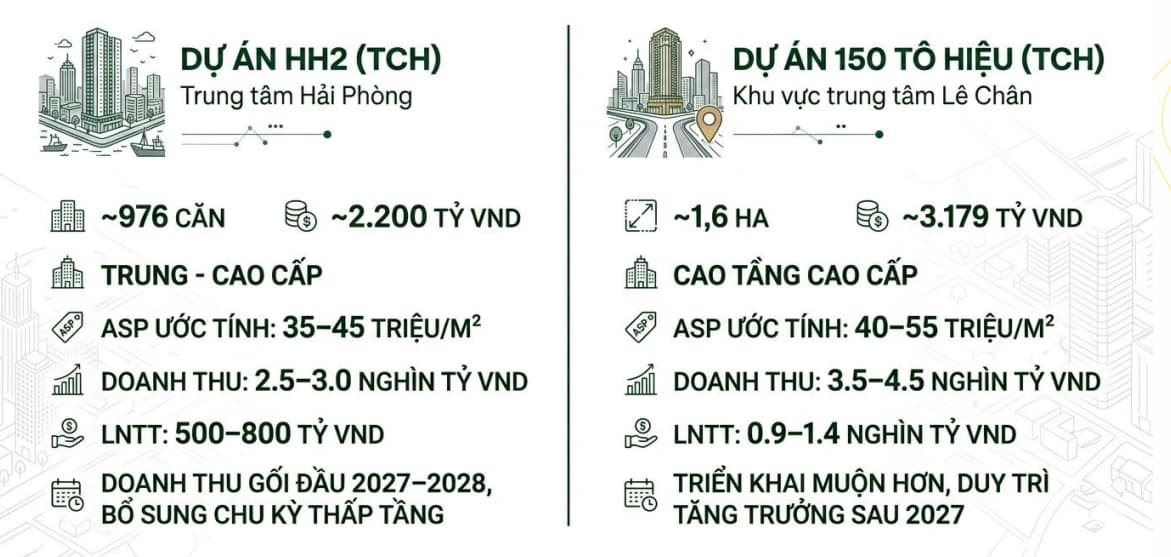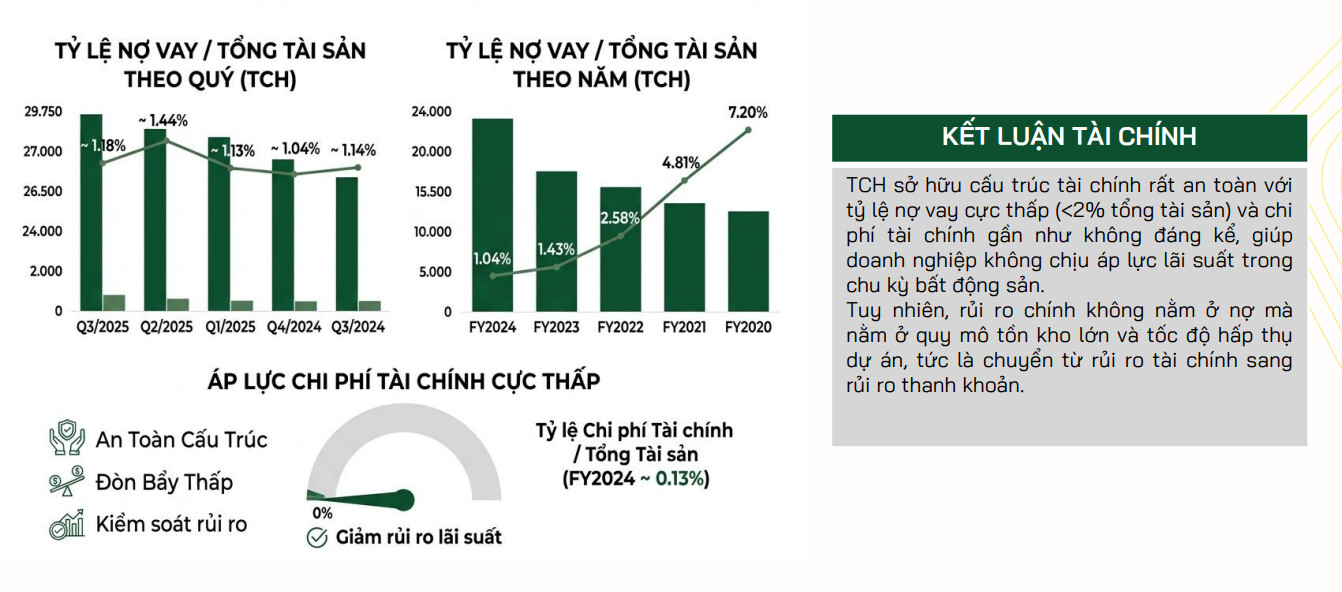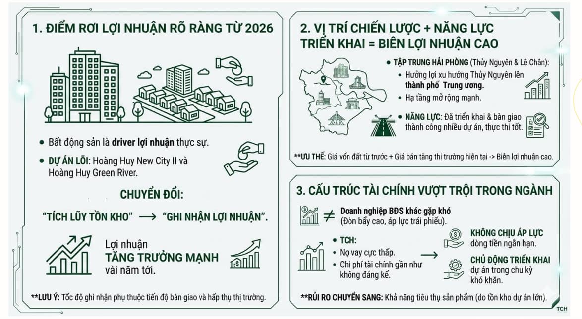 TCH bước vào điểm rơi lợi nhuận từ 2026 khi các dự án lớn bắt đầu bàn giao, trong khi duy trì cấu trúc tài chính rất an toàn với đòn bẩy thấp. Nếu thị trường bất động sản phục hồi, doanh nghiệp có dư địa tăng trưởng mạnh nhờ lượng hàng tồn kho lớn đang chờ ghi nhận. Giá mục tiêu chúng tôi đưa ra với TCH sẽ là 26.000 trong khung thời gian 1 năm.
