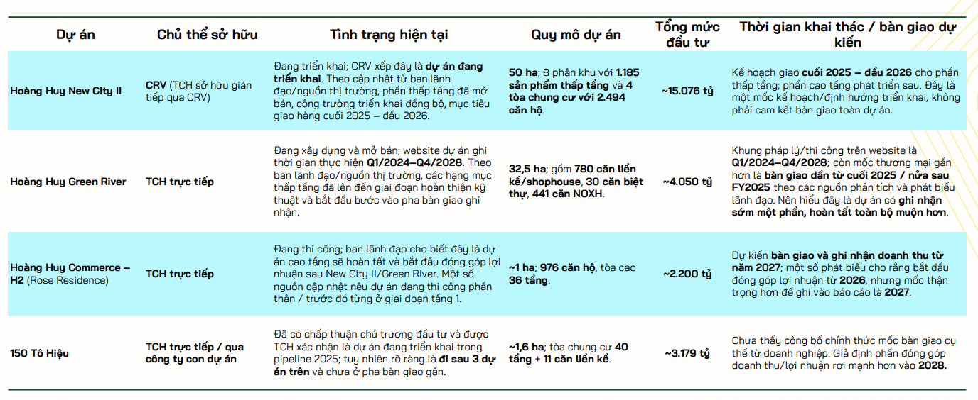 Doanh nghiệp sở hữu quỹ đất lớn cũng như 3 dự án khác đang thu tiền về tuy nhiên đều không được liệt kê vào danh sách dưới do không có đóng góp vào định giá. Nội lực của TCH sẽ tập trung vào 4 dự án đều có điểm rơi vào 2026-2028 như sau: