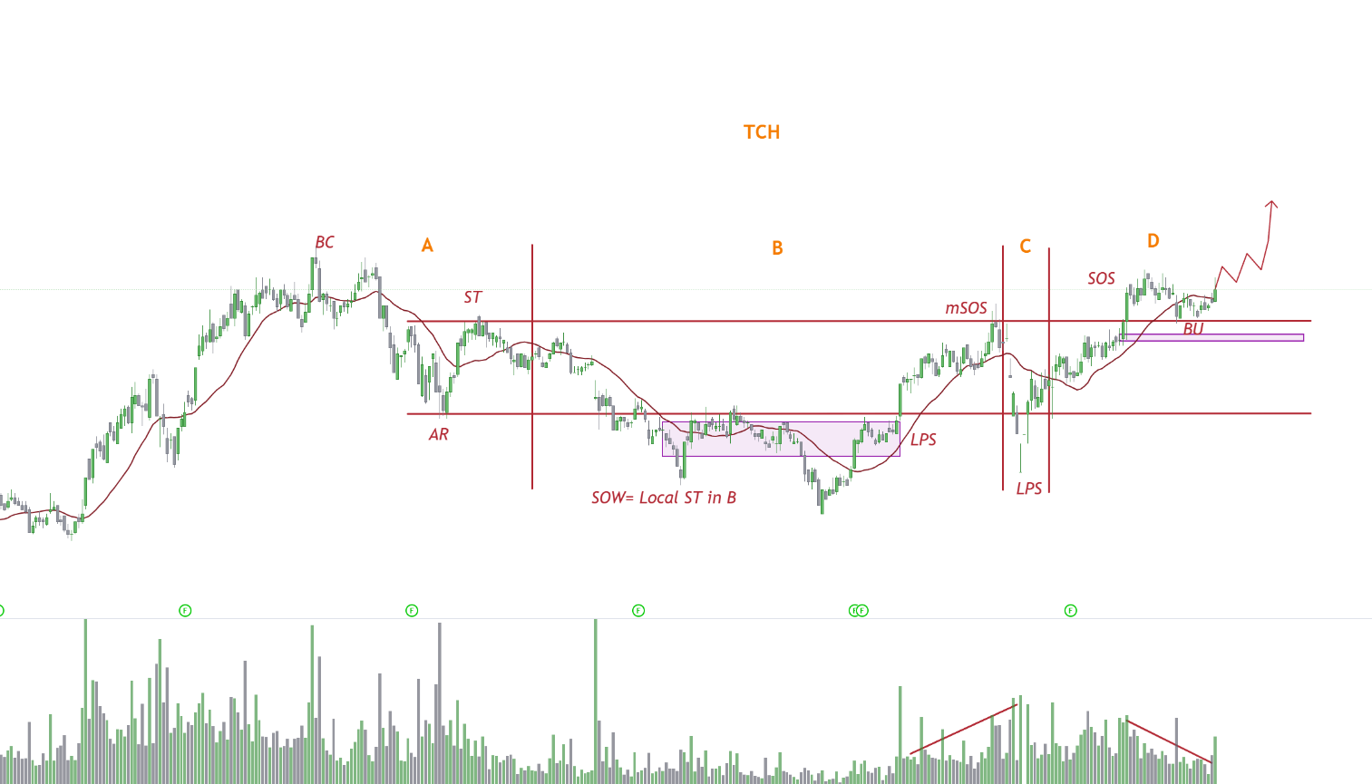 -Cấu trúc lớn: TCH hiện đang hình thành được 1 Trading Range hơi biến thể đi ngang tái tích lũy trong khoảng 1 năm trở lại đây với đầy đủ các pha, sự kiện và hiện tại đang đứng trước cơ hội lớn để xác nhận cấu trúc, xác nhận bước vào pha E đẩy giá chính sau 1 năm xây dựng nguyên nhân tích lũy. TCH hiện đang hình thành 1 cấu trúc tích lũy Wyckoff hơi biến thể (mẫu hình tích lũy số 2) hay mọi người thường gọi là mẫu hình cốc tay cầm .