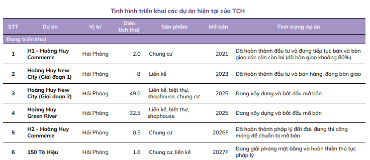 ➢ KQKD thời gian tới dự kiến tiếp tục tăng trưởng tích cực. Trong NĐTC 2025, TCH dự kiến sẽ mở bán 2 dự án trọng điểm là Hoàng Huy New City GĐ2 và Hoàng Huy Green River còn dự án Hoàng Huy Commerce (H2) có thể mở bán từ năm 2026. Các dự án này có thể bắt đầu bàn giao và ghi nhận doanh thu từ cuối NĐTC 2025, tổng doanh thu có thể mang lại từ các dự án này đạt khoảng hơn 25 nghìn tỷ đồng, đảm bảo nguồn ghi nhận doanh thu đến năm 2028 cho doanh nghiệp.
