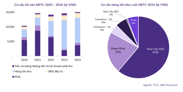 - Hàng tồn kho lớn, đảm bảo nguồn ghi nhận doanh thu thời gian tới. Tại cuối Q4/NĐTC 2024, hàng tồn kho của TCH chiếm tỷ trọng lớn nhất trong tổng tài sản với giá trị 8,5 nghìn tỷ đồng (chiếm 55,3% tổng tài sản), giảm 13,9% so với thời điểm đầu NĐTC 2024. Hàng tồn kho chủ yếu là giá trị của (i) các dự án BĐS dở dang 7,4 nghìn tỷ, bên cạnh (ii) thành phẩm BĐS 603 tỷ (chủ yếu là của dự án Hoàng Huy Commerce H1 – 510 tỷ; Hoàng Huy New City 56 tỷ) và (iii) HTK kinh doanh ô tô 458 tỷ. Về (i), giá trị các dự án BĐS dở dang, chủ yếu là giá trị của dự án Hoàng Huy New City GĐ2 (dự án Khu đô thị mới dọc đường Đỗ Mười) giá trị 5,2 nghìn tỷ; Hoàng Huy Green River 1,8 nghìn tỷ; Hoàng Huy Commerce H2 – 392 tỷ. Các dự án này sẽ được mở bán trong năm 2025 và được bàn giao trong giai đoạn tiếp theo, đóng góp lớn vào KQKD của doanh nghiệp.