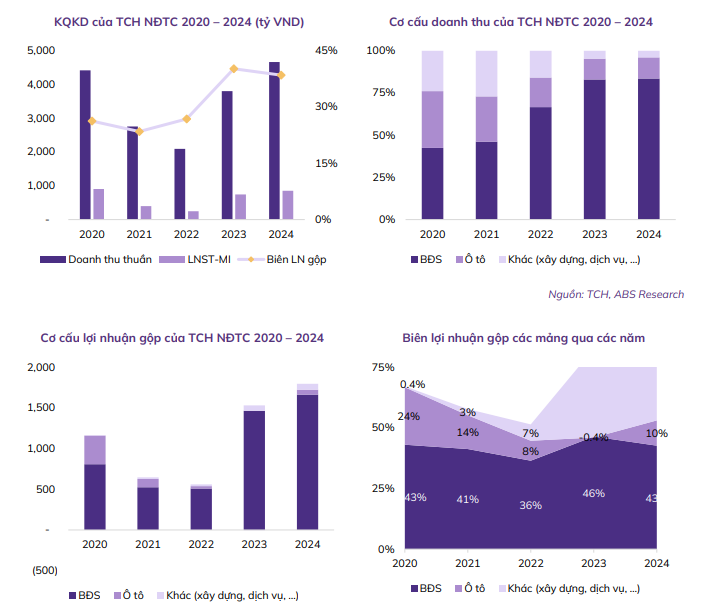 Mảng BĐS tiếp tục giữ vai trò chủ đạo trong hoạt động kinh doanh. Mảng BĐS trong NĐTC 2024 chiếm 84% cơ cấu doanh thu của TCH (tăng từ giai đoạn 2018 – 2019 khi chỉ ở mức 6%), trong khi mảng kinh doanh ô tô chỉ còn đóng góp 13% (so với mức 90% năm 2018). Tương tự, lợi nhuận gộp của mảng BĐS cũng đóng góp phần lớn vào lợi nhuận gộp của TCH. Với biên lợi nhuận cao, trung bình đạt trên 40% (so với mảng ô tô từ 10-20%) giúp biên lợi nhuận chung của doanh nghiệp cải thiện, đạt khoảng 40% trong giai đoạn 2023 – 2024.