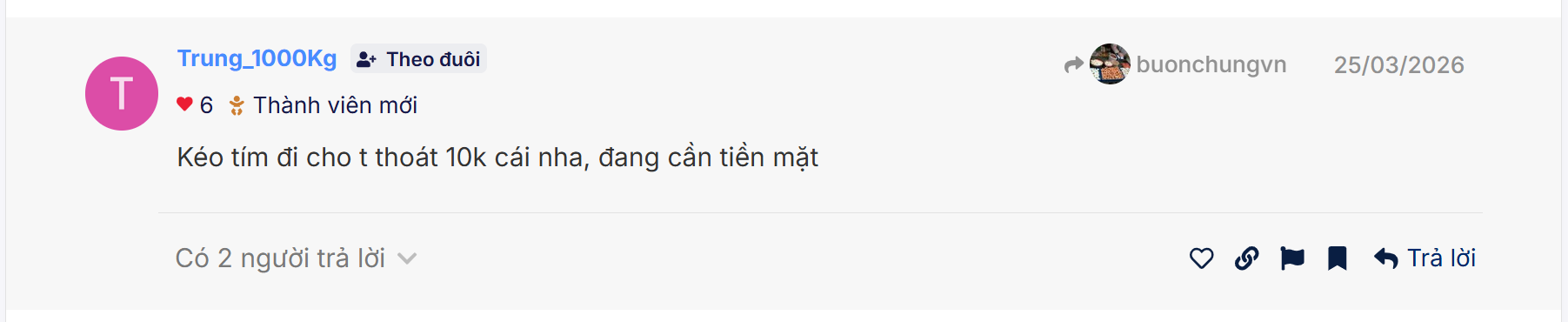 bác chủ viết TCO e thây khách quan đó - TCO Hiên nay phản anh hết moi thứ câu chuỵen BLD, nhân sự mới, tay chơi mới, tai câu trúc DN ----> giờ TCO muốn đi tiếp thực sự bền vũng cần hiện thực hoá DOANH THU - LN trong năm 2026 nhưng với góc đô NDT như tôi thấy TCO 2026 vẫn là game đâu cơ về sự ky vọng BLD mới, câu chuyện mới, tương lai mới vẫn là câu chuyện đếm cua trong lỗ - vì mảng mới TCO tham gia góp vôn hiện năm nay vân chưa thực hiện hoá lơi nhuận - mảng bds góp vốn thì lai càng chưa an được liên ! nên là TCO đoan nay tăng qua nóng phản anh hầu như moi yêu tố tin tức - nên chờ thêm hạn chế fomo tranh bị úp bô. thân ái