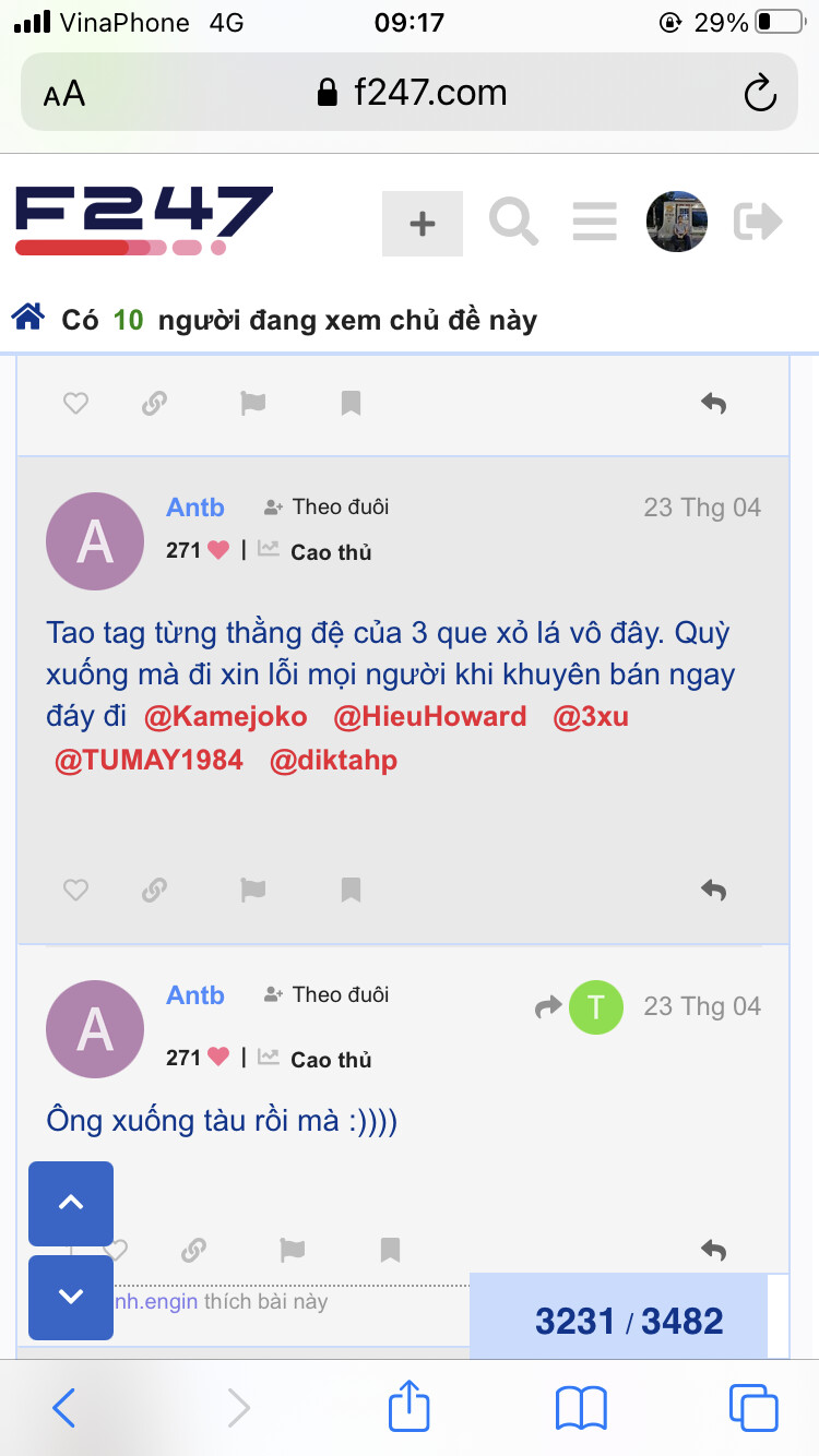 Thật sự m cũng ko rảnh quan tâm đến ông Antb j đó, hôm nó tag bảo m quỳ xuống xin lỗi ae m đã ko thèm nói lại r mà nó cứ vào ăn nói lố lăng dụ ae f0 nên hnay m lên tiếng. Bjo nghe nó càng mua càng lỗ, xong lên tí thì vào hô hào tiếp rồi thuỷ triều xuống là ko còn quần mà mặc!
