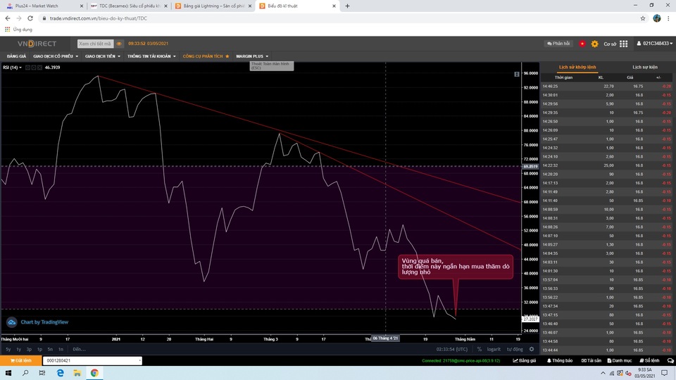 Hiện tại, trong ngắn hạn TDC đã mất trend tăng, nên việc mua TDC và hi vọng ngày mai ăn lãi ngay là không thể. Tuy nhiên, cũng trong ngắn hạn này, TDC đã bước vào vùng quá bán, nên các bác vẫn còn cash có thể giải ngân nhè nhẹ 5-10 % (hình 1)