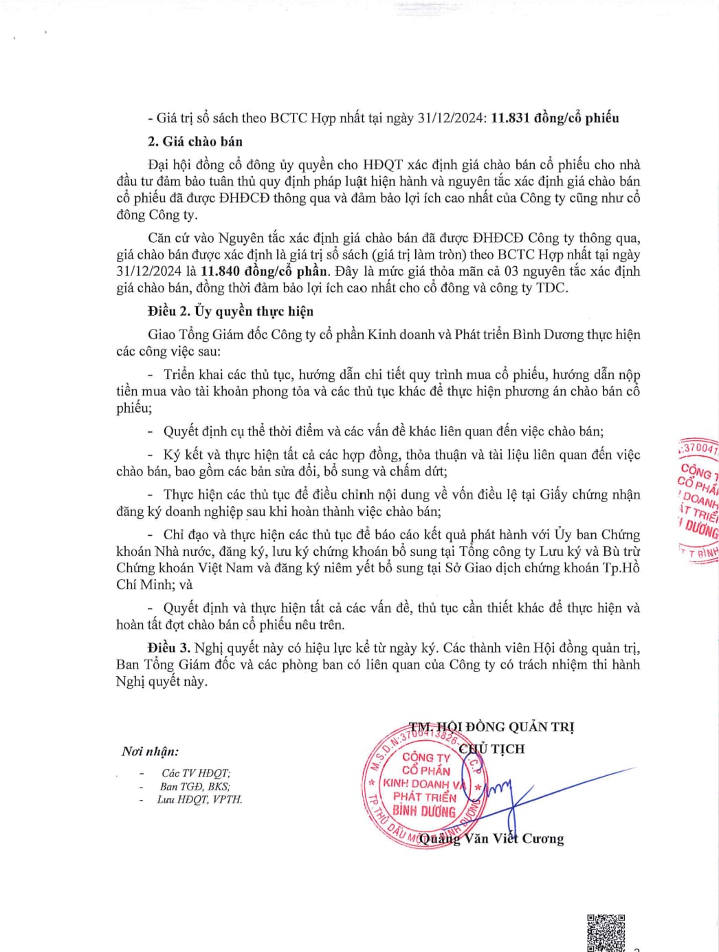 Ngoài ra, Kinh doanh và Phát triển Bình Dương thông qua danh sách 8 nhà đầu tư dự kiến mua 35 triệu cổ phiếu riêng lẻ trong đợt chào bán 35 triệu cổ phiếu để nâng vốn điều lệ từ 1.000 tỷ đồng lên 1.350 tỷ đồng. Trong đó, năm nhà đầu tư là lãnh đạo bao gồm ông Hồ Hoàn Thành, thành viên HĐQT kiêm Phó tổng giám đốc dự kiến mua 5 triệu cổ phiếu để nâng sở hữu lên 3,7% vốn điều lệ; ông Phạm Thanh Sơn, Giám đốc phòng Xây dựng dự kiến mua 5 triệu cổ phiếu để nâng sở hữu lên 3,7% vốn điều lệ; ông Trần Thành Tài, Giám đốc Xí nghiệp Bê tông dự kiến mua 5 triệu cổ phiếu để nâng sở hữu lên 3,7% vốn điều lệ; lãnh đạo Nguyễn Ngô Hướng Dương, Giám đốc phòng Kinh doanh dự kiến mua 5 triệu cổ phiếu để nâng sở hữu lên 3,72% vốn điều lệ; ông Đặng Đình Phúc, thành viên HĐQT độc lập dự kiến mua 5 triệu cổ phiếu để nâng sở hữu lên 3,81% vốn điều lệ.