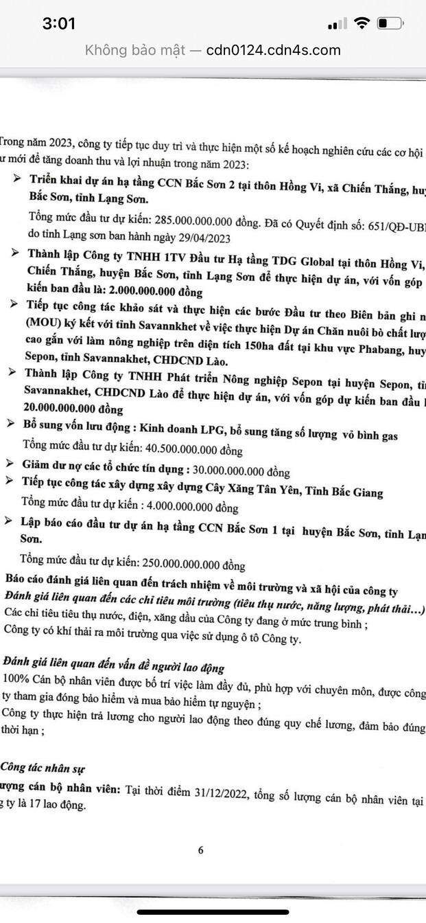 Bên cạnh đó, trong kế hoạch kinh doanh năm nay, công ty cũng cho biết sẽ thành lập Công ty TNHH Một thành viên Đầu tư Hạ tầng TDG Global để thực hiện dự án Cụm công nghiệp Bắc Sơn 2. Vốn góp dự kiến ban đầu là 2 tỷ đồng.