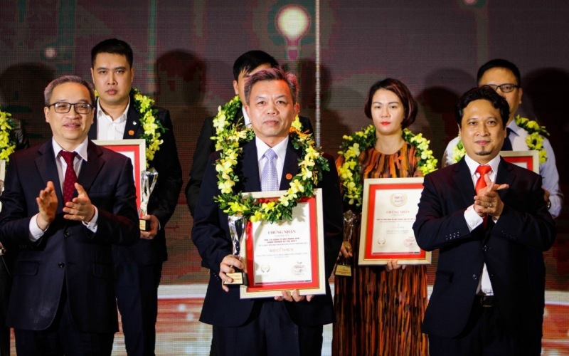 Thứ trưởng Thông tin và Truyền thông Phan Tâm và Tổng Giám đốc Vietnam Report trao Cúp và Giấy Chứng nhận cho Phó Tổng Giám đốc Becamex IDC Nguyễn Văn Thanh Huy (Ở giữa, hàng đầu).