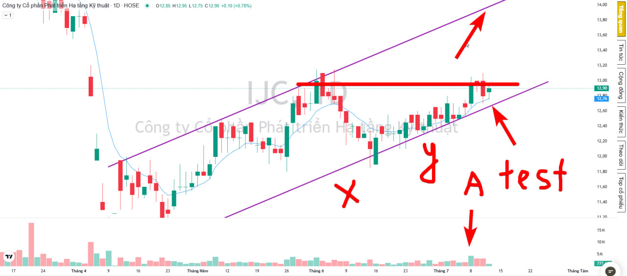 A upbar biên độ lớn, đóng cửa cao, ở 1 vùng cung, khối lượng lớn, vùng này giá đang test lại đỉnh cũ, nếu test thành công, giá đi lên thì kỳ vọng lên đường xu hướng trên
