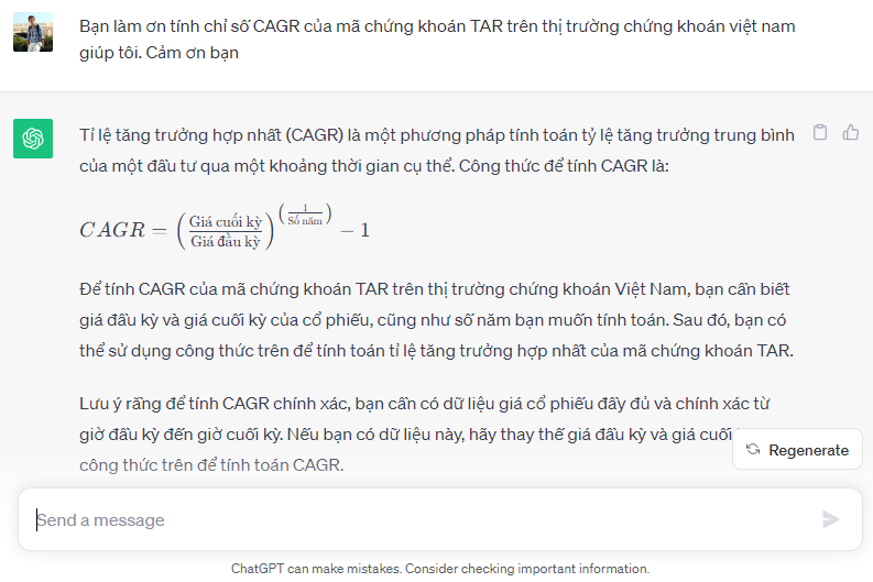 Thấy mọi người nói chỉ số CAGR, em thử hỏi chatgpt. Nó trả lời thế này anh…
