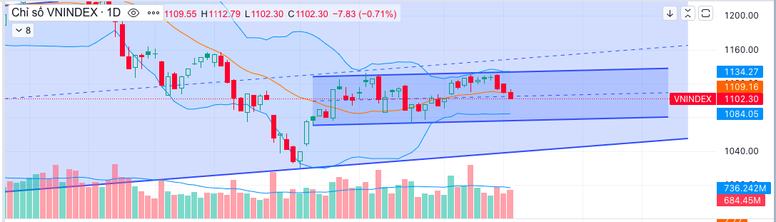 Về kỹ thuật, ngắn hạn VNI vẫn đi trong box sideway 1080 - 1133 nên nhìn nhận theo kỹ thuật thì việc sau nhiều phiên nỗ lực ở vùng cạnh trên không vượt được, VNI đã quay đầu chỉnh lại là chuyện cũng bình thường. Vì vậy, khả năng tuần này VNI sẽ về test vùng hỗ trợ dưới 1080-1090 rồi sau đó quay lại với thử thách vượt 1133 thêm một lần nữa.