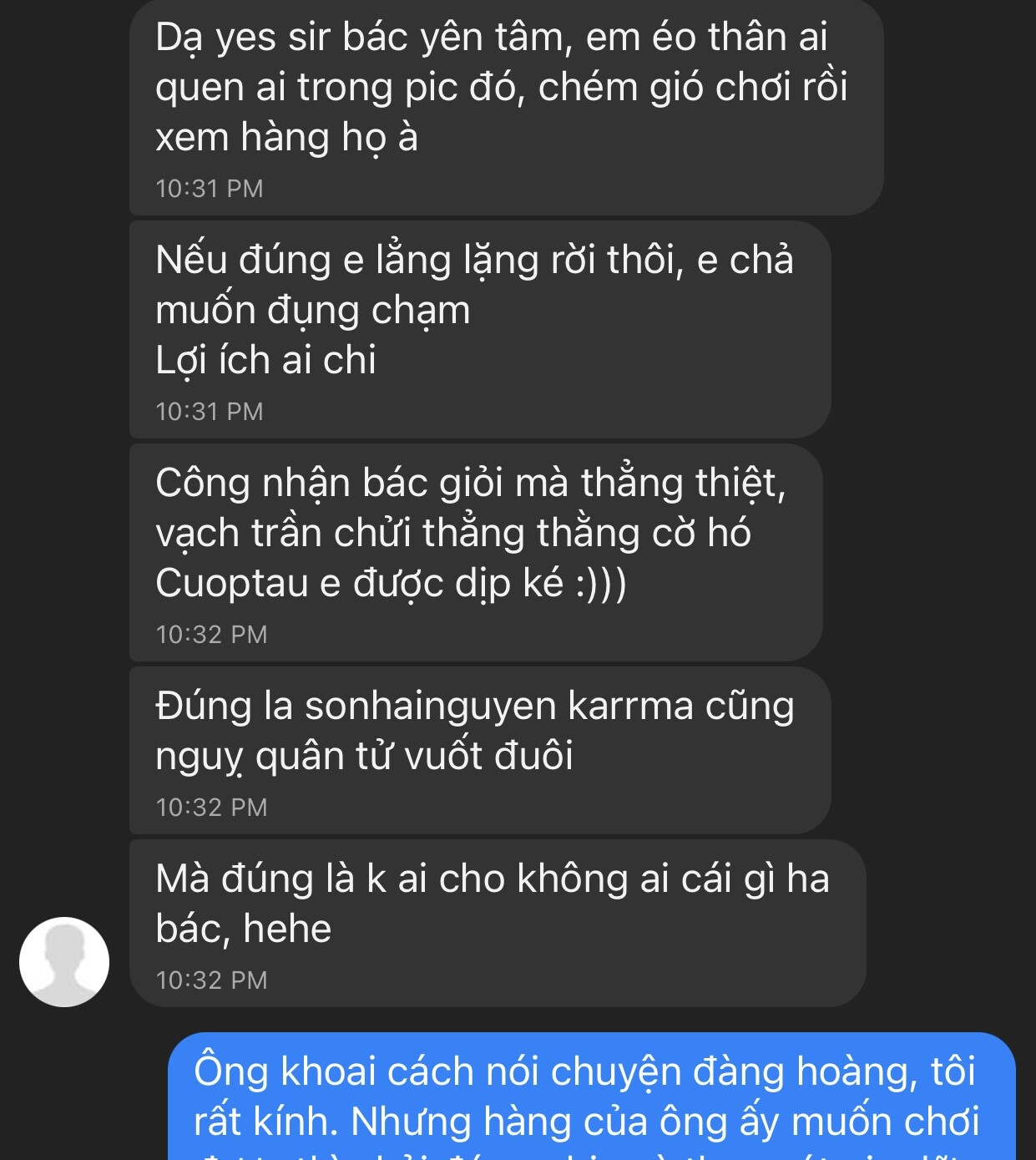 Em nói thật nhé anh Khoai! Em vẫn tôn trọng anh nên chưa từng có lời nào không hay về anh ạ! Uy tín của anh gần đây xuống thấp là do chính con c.hó của anh thôi! Nó đi cắn bậy thì có người tìm đến chửi thôi anh ạ! Anh rọ mõm nó lại đi anh!