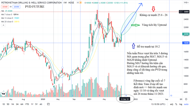 Vượt qua giá 21-21.2 tức Upband 3 là đường màu tím thì PVD sẽ tăng mạnh