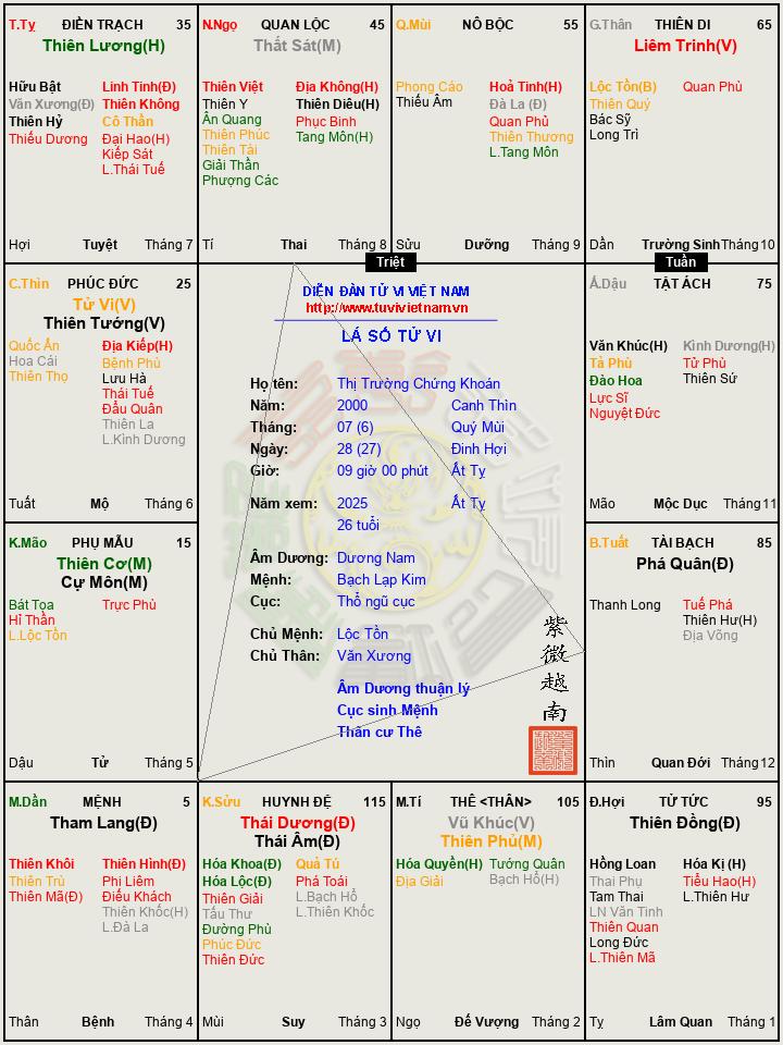 Năm 2025, Lưu niên Đại vận về cung Tài Bạch có Phá Quân đắc địa tại đất Quan Đới. Phá Quân là sao của sự cải cách, đột phá mạnh mẽ và quyết liệt để xây dựng những điều mới, nhất là khi có sự hội họp của Không - Kiếp hãm địa càng khiến cho sự biến động này càng lớn, nổi bật trong năm nay chính là “Cú sốc Thuế quan” để hình thành cú rũ bỏ cuối cùng và dẫn dắt thị trường vào nhịp đẩy giá quan trọng vượt đỉnh lịch sử. Vượt 1500 nhẹ nhàng cũng cho thấy sự phá cách của Phá Quân.